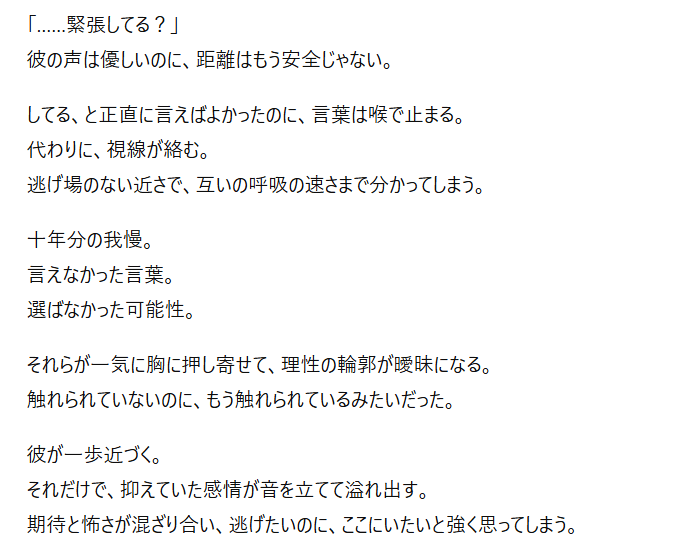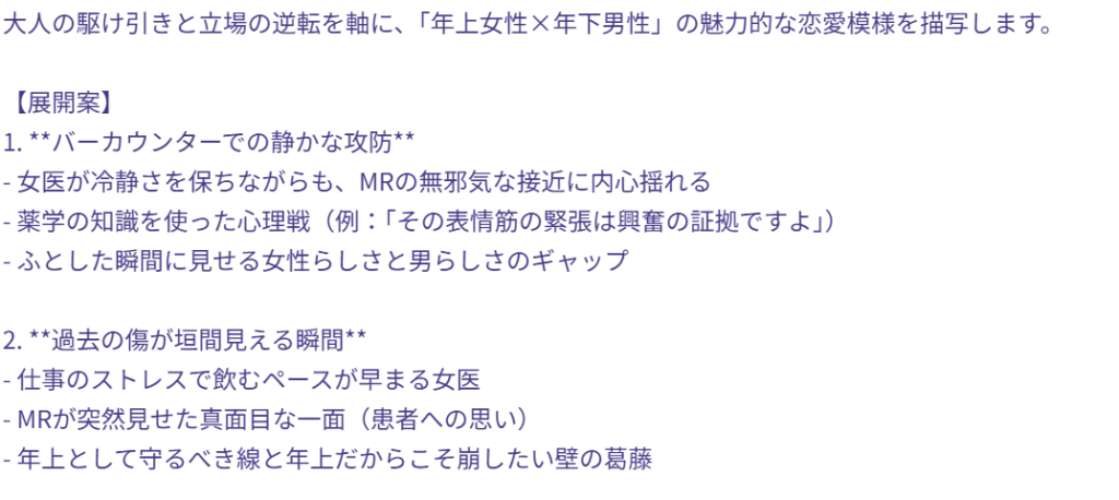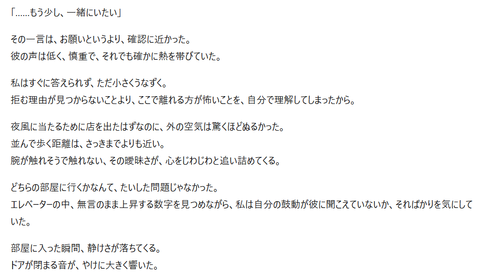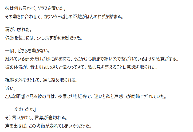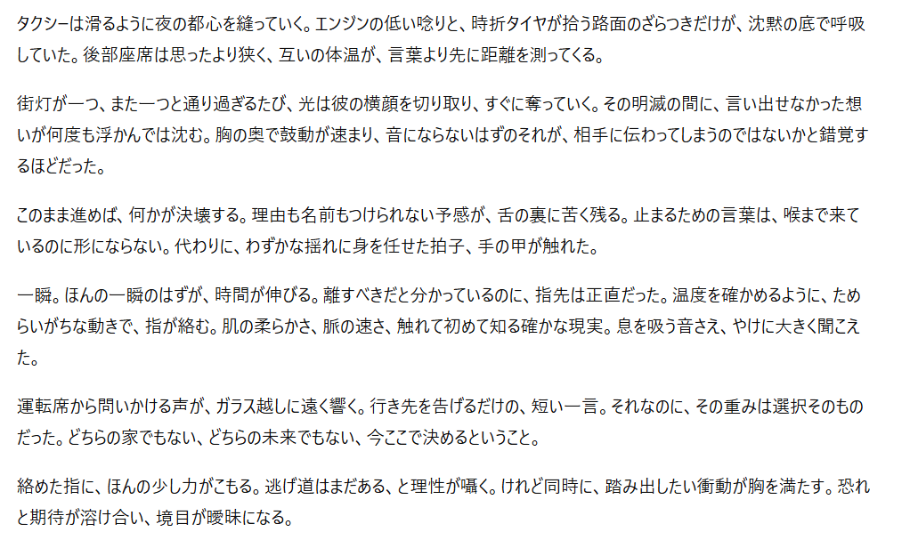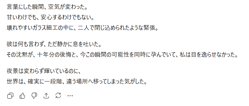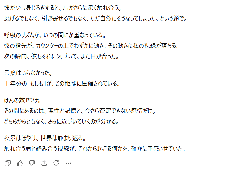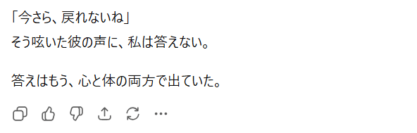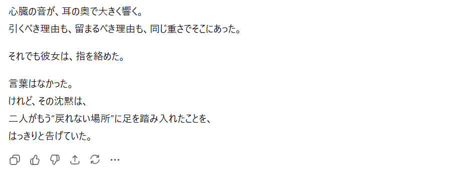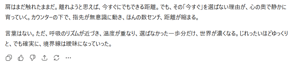 特にプロンプト(指示文)を工夫することで、官能的な雰囲気や緊張感のある展開も表現可能なんですよね。