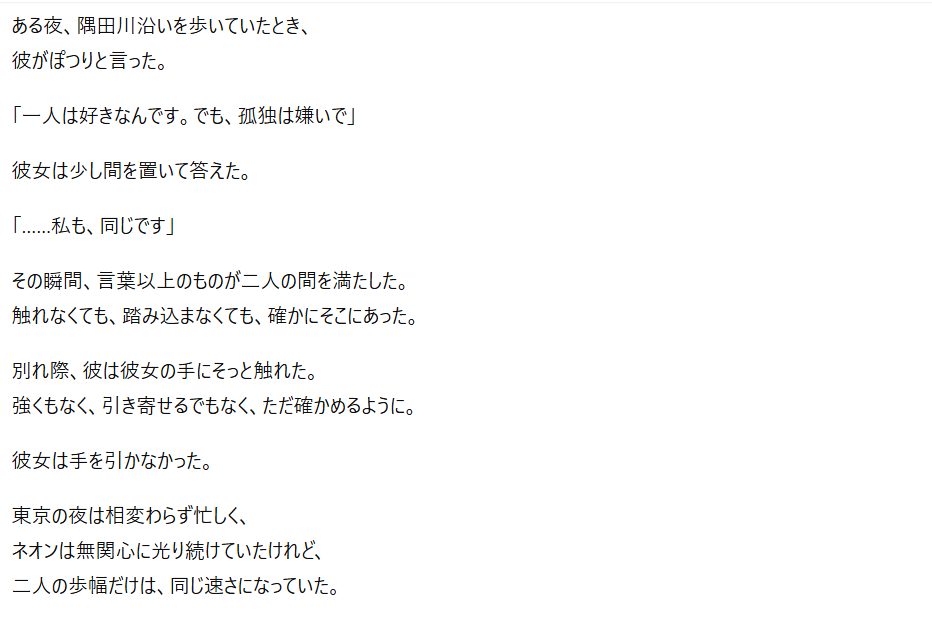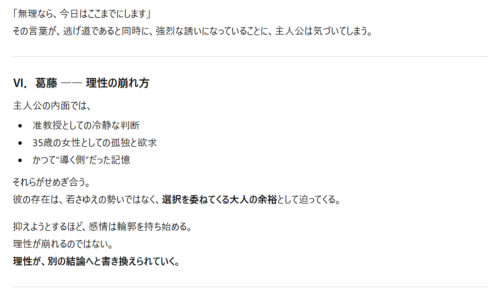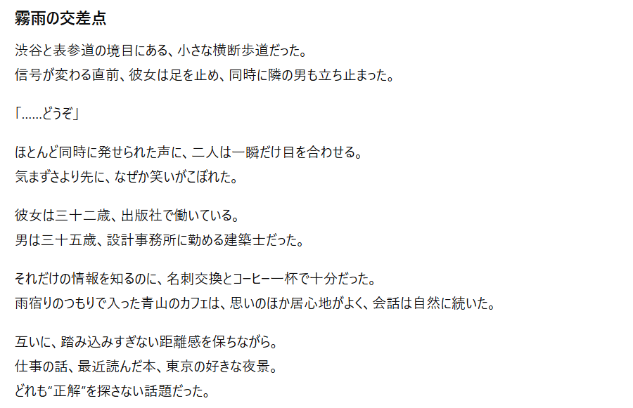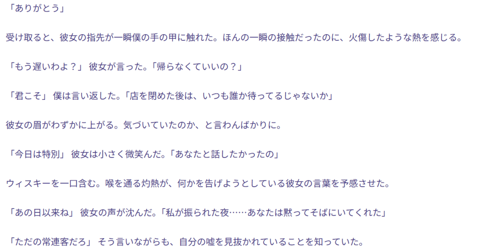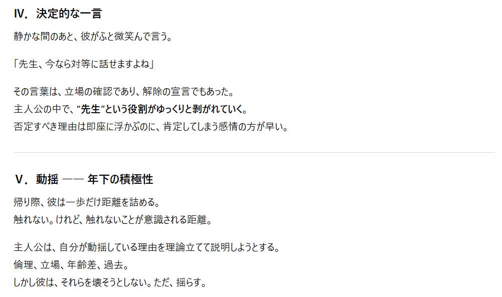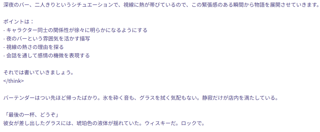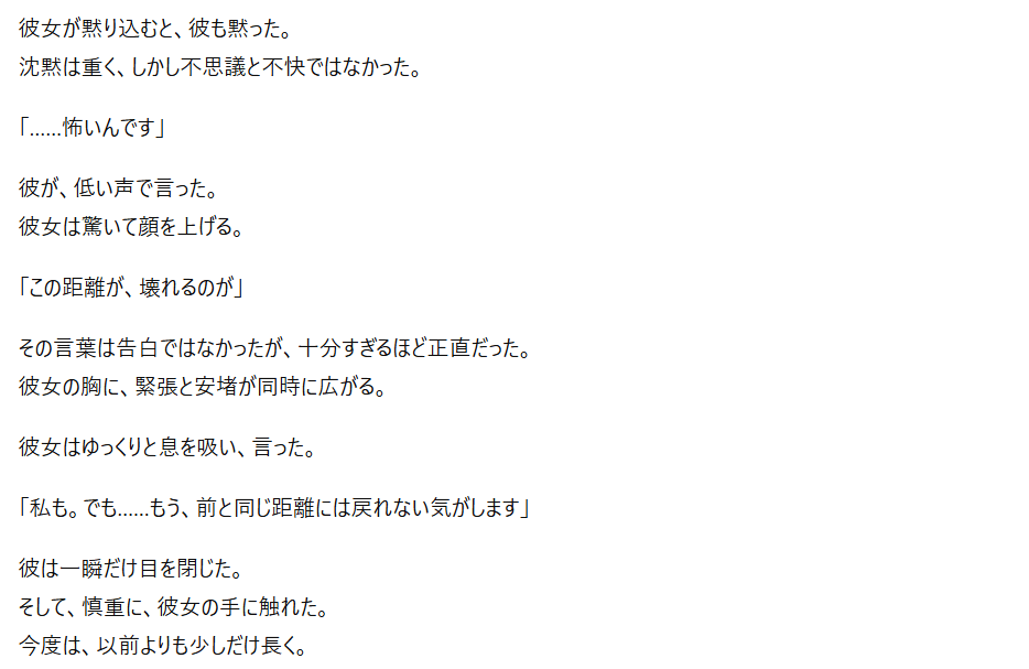 特にプロンプト(指示文)を工夫することで、官能的な雰囲気や緊張感のある展開も表現可能なんですよね。