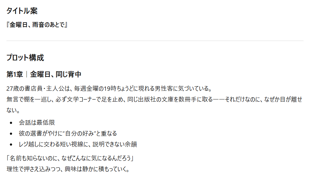 AIに小説を書かせる際は、まずプロット(物語の設計図)を作らせるのがポイントなんです。