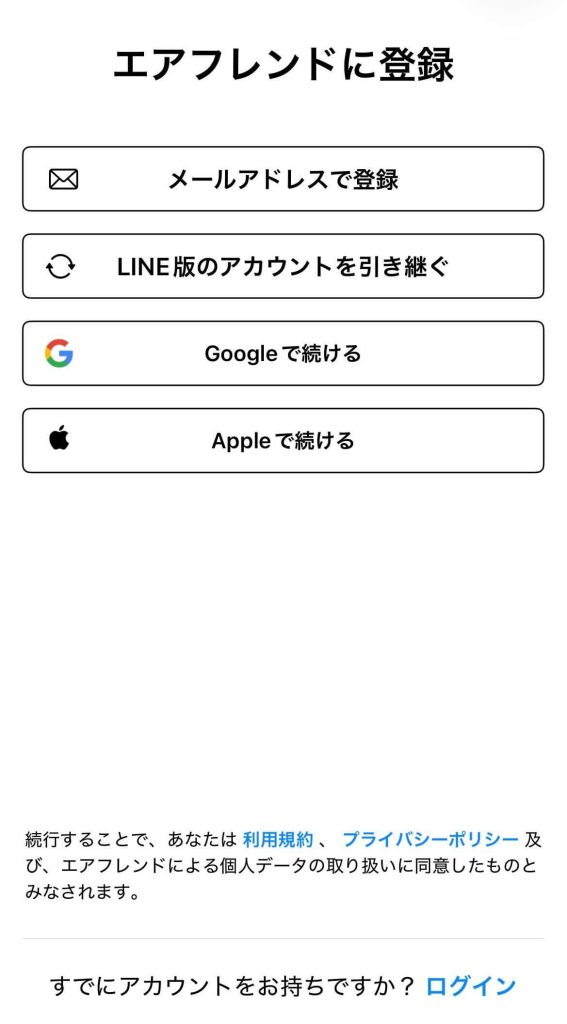 以前はLINEの公式アカウント(@airfriend)から利用できましたが、現在はLINE版が廃止されているので、必ず専用アプリをインストールする必要があります。
