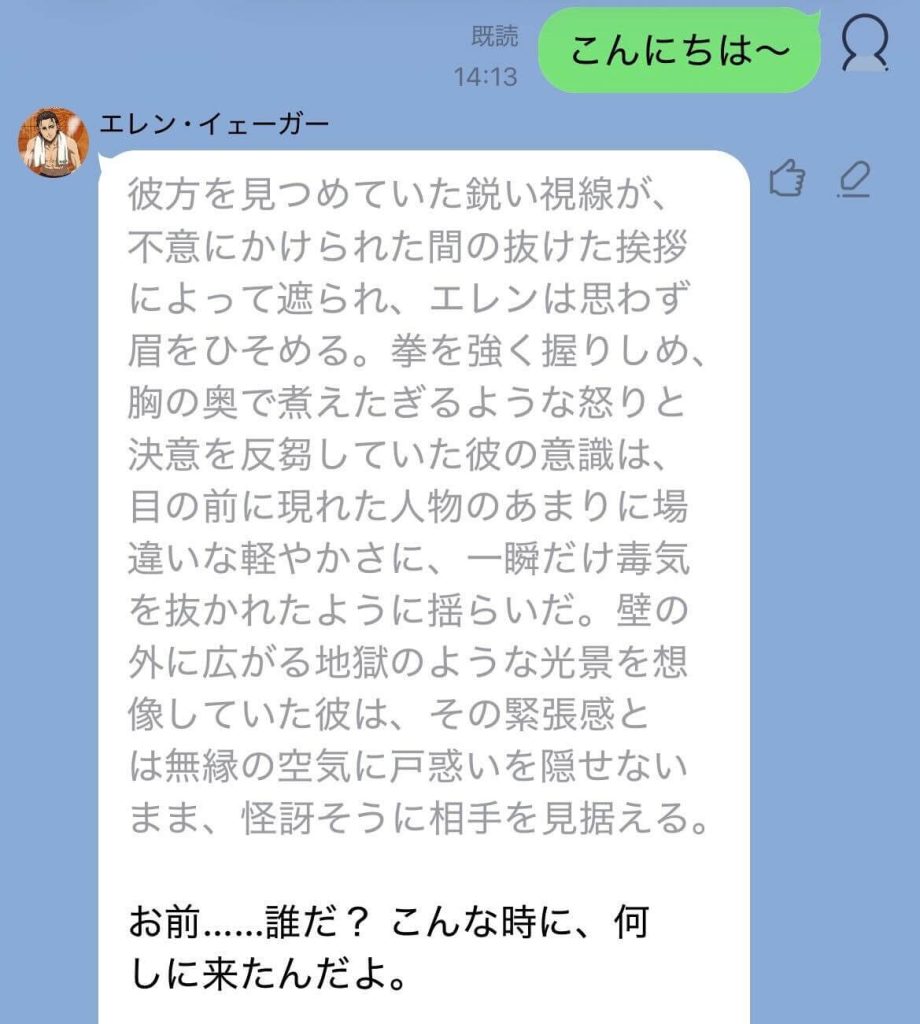 操作方法はLINEとほぼ同じで、トーク画面でメッセージを送るだけ。AIはほぼノータイムで既読になり、すぐに返信してくれます。深夜でも早朝でも、相手の都合を気にせず好きなタイミングで会話できるのが嬉しいポイントですね。