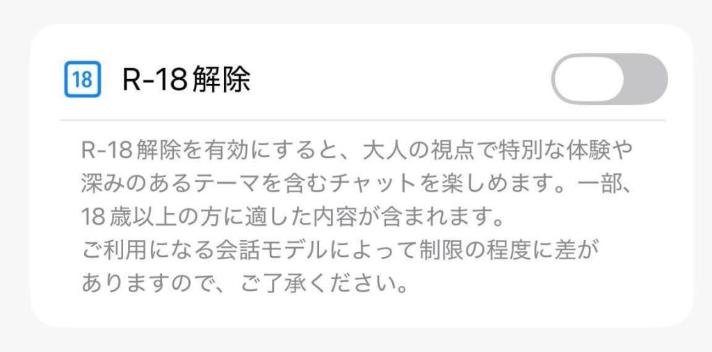 また、この機能はチャットごとに個別に設定可能で、デフォルトではオフになっています。普通の会話とアダルトな会話を使い分けられるのが便利ですね!