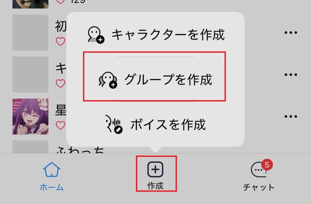 ①メニューの「作成」をタップ→「グループの作成」を選択