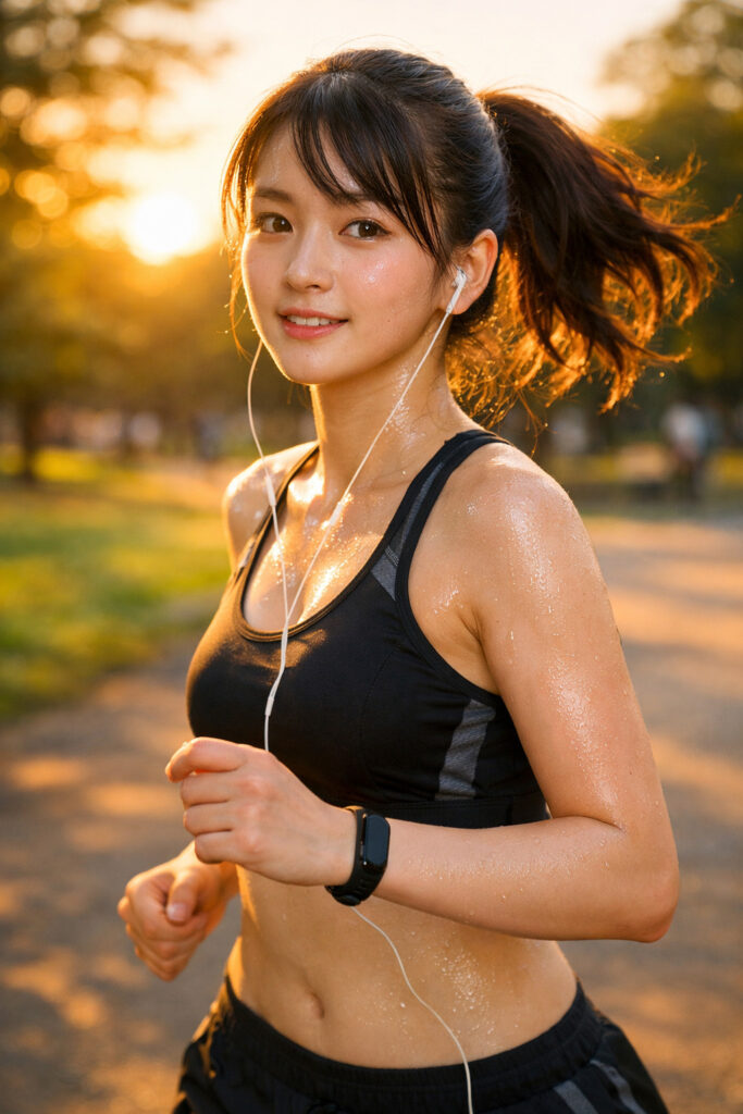 photorealistic, masterpiece, 1japanese woman, cute face,20 years old, fair skin, ponytail, athletic wear, jogging in a park, sunset, golden hour lighting, slight sweat on skin, rim lighting, movement blur in background, sharp focus on subject, detailed skin pores