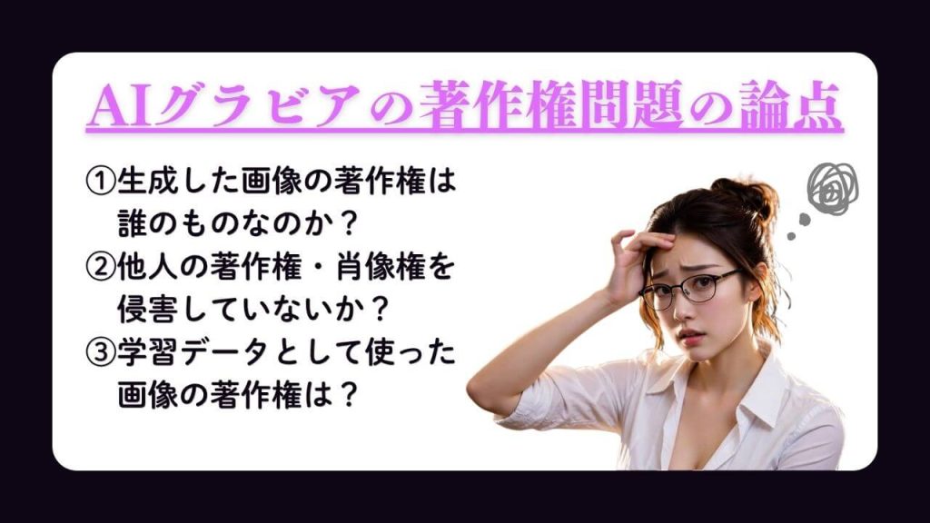 AIグラビアをめぐる著作権の問題は、大きく分けると3つの論点があります。