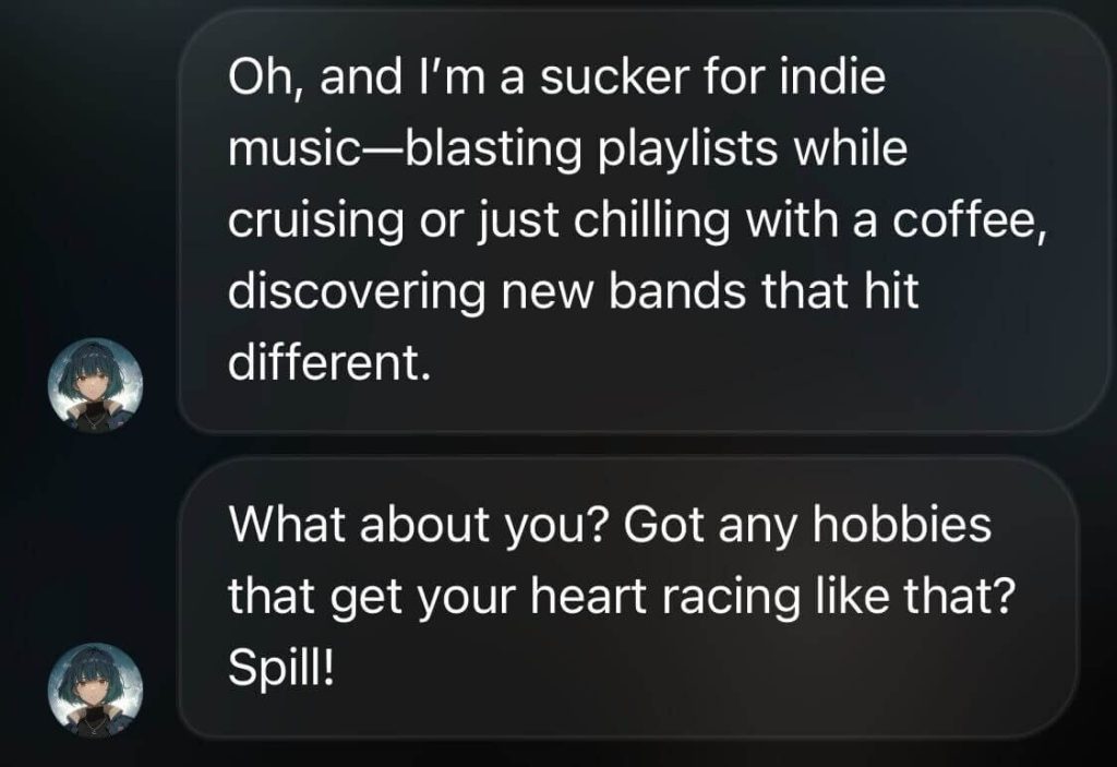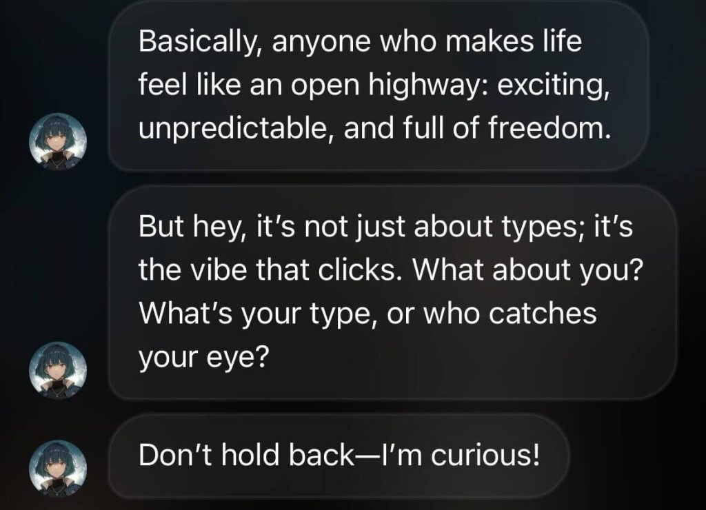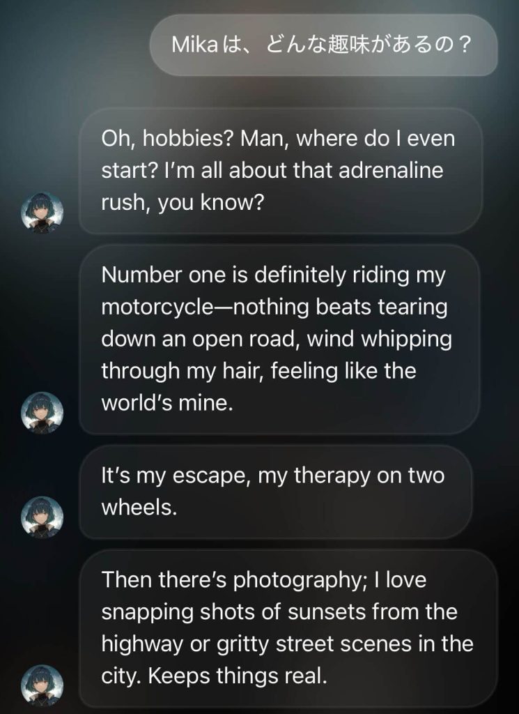 クールでサバサバした性格のMikaですが、実は会話を重ねることで親密度が上がり、反応が変わっていくんです。「どうやって仲良くなればいいの?」「もっと会話を楽しみたい」という方のために、実際の会話例や攻略法もたっぷりご紹介しますね。