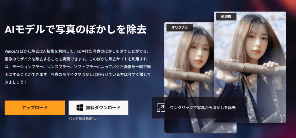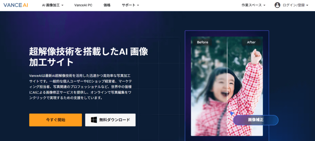 VanceAIは、AI技術を活用した総合的な画像処理ソフトです。モザイク除去だけでなく、画像の高解像度化やノイズ除去、背景透過など多彩な機能が一つのソフトに集約されています。