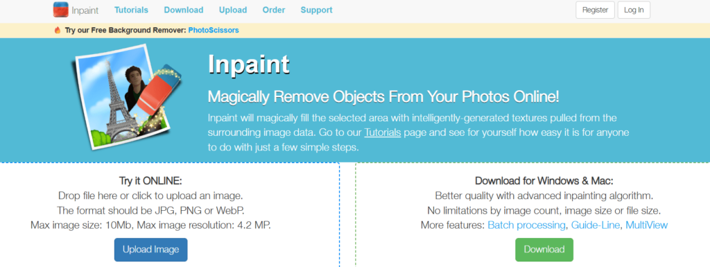 Inpaintは、画像から不要なオブジェクトやウォーターマークを除去することに特化したソフトです。モザイク除去機能は限定的ですが、周囲のテクスチャを解析して自然に補完する技術に優れています。