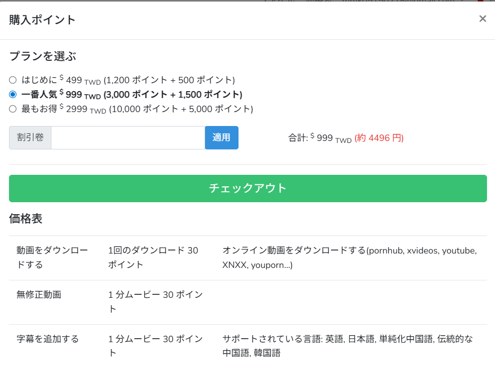 | 料金 | 499台湾ドル/約56分の動画処理(約2,000円) |