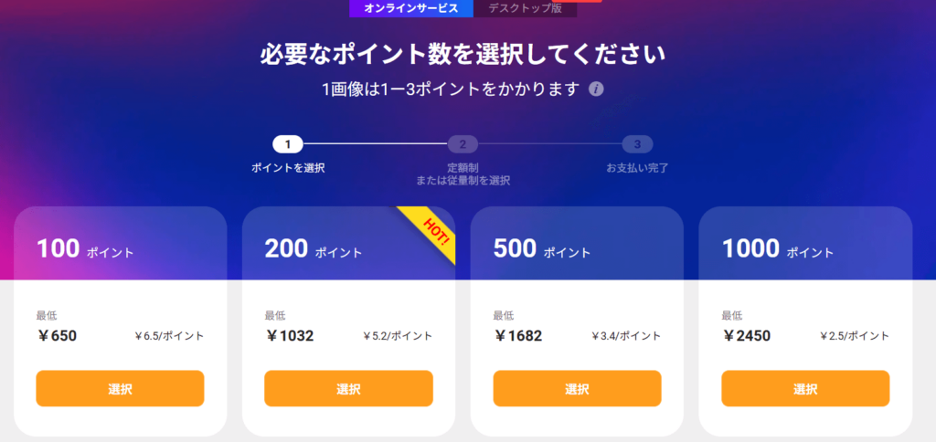 | 料金 | 650円/100画像〜(ポイント制) |