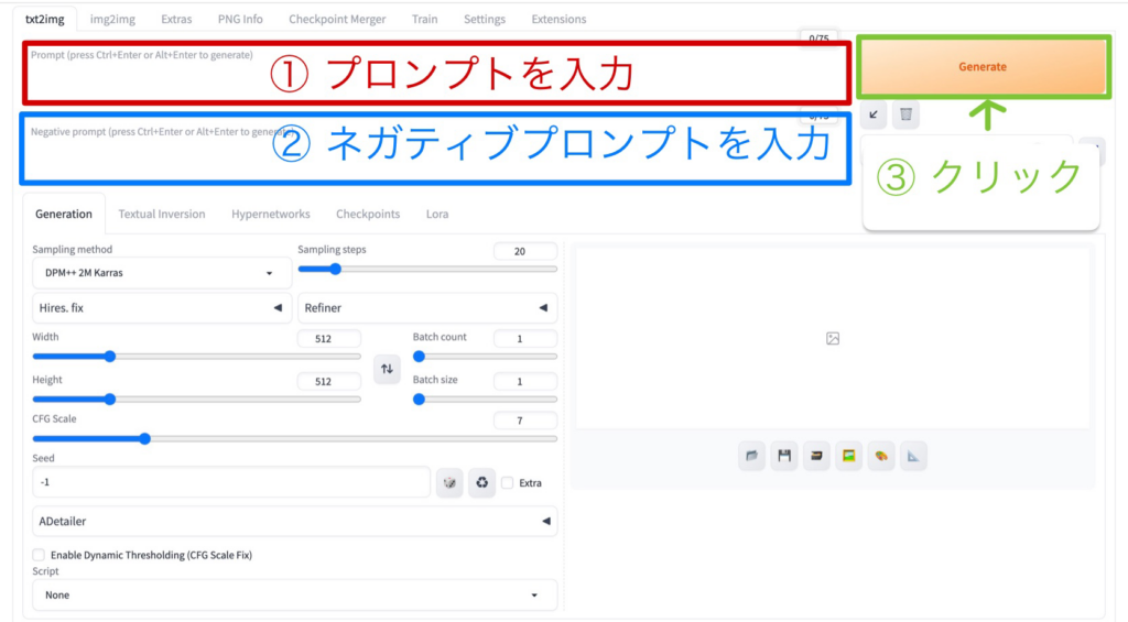 ① 呪文(プロンプト)を入力する。