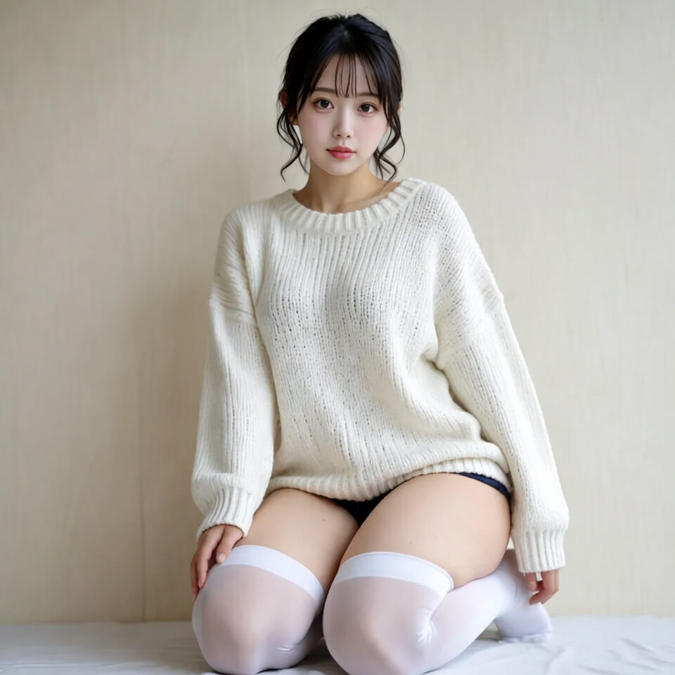 short statureやpetiteで低身長を指定しつつ、thick thighsでふとももをしっかりむちむちにするのがポイントです。oversized sweater(オーバーサイズのセーター)との組み合わせは、小柄なむちむち体型との相性が特に抜群なのでおすすめですよ!