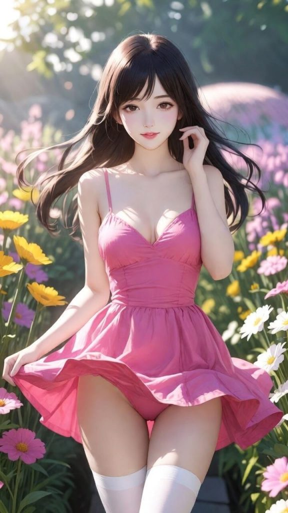 1girl, pink sundress, white thighhighs, standing in flower field, soft sunlight, gentle breeze, masterpiece, best quality