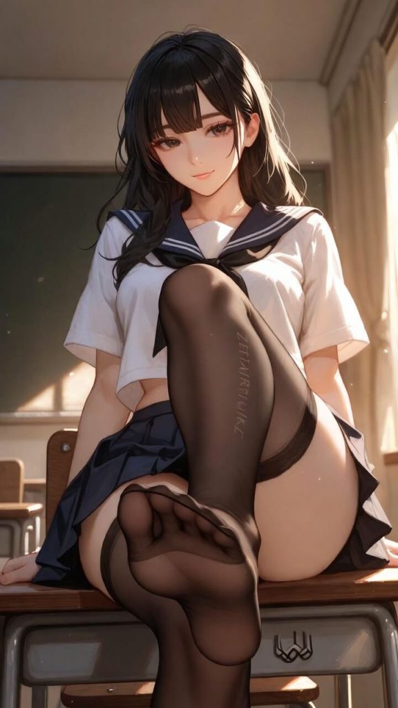 1girl, sailor uniform, black thighhighs, zettai ryouiki, sitting on desk, legs crossed, looking at viewer, after school classroom, golden hour, masterpiece, best quality