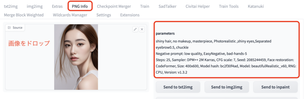 そんな時は上部ダグから PNG Info を選択し、画像をドロップしましょう。